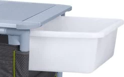 Eine vielseitige Küchenbox, die in keinem Camperhaushalt fehlen sollte. Beschichtete Innenseite. Besonders robuste, langlebige Konstruktion, die auch mehrmaligen Auf- und Abbau unbeschadet übersteht. Alle 4 Standbeine sind höhenverstellbar. Die Ablageplatten sind aus beschichteter Hartfaserplatte. Die innenliegende Kunststoffspüle kann durch die Aluminiumrollplatte abgedeckt werden, seitlich herausziehbar.