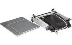 Neu entwickelter Mehrzweckschrank mit CROSS-Rahmen aus Aluminiumrohr. 1 Fuß des Schrankes ist höhenverstellbar, schwenkbar und groß genug, um ein Absinken in weicheren Böden zu verhindern. Mit großem Staufach und einer Arbeitsplatte aus verstärktem MDF-Material.