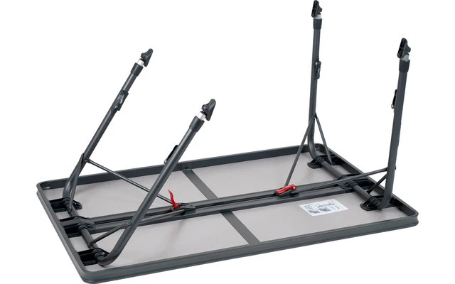 Sehr stabiler Campingtisch mit hoher Qualität. Die zusätzlich integrierten Aluminiumschienen an der Unterseite des Tisches und robuste, verstärkte Tischbeinrohre sorgen für extra Stabilität. Die Tischplatte ist hitzebeständig und wasserdicht.