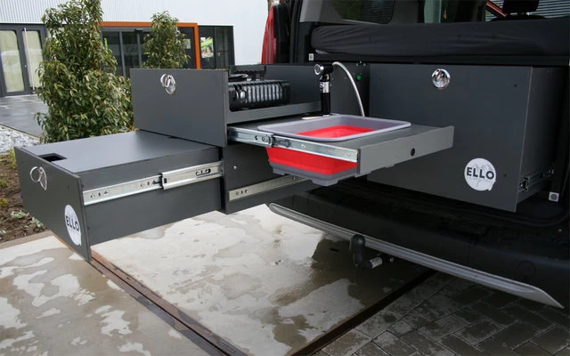 Eine vollwertige Heckküche bietet Abstellfläche für Gaskocher, eine Wasserversorgung mit fließend Wasser, eine Spüle auf Seitenauszug und extra Raum zur Integration passender Kühlboxen (bei zwei Schubkästen).